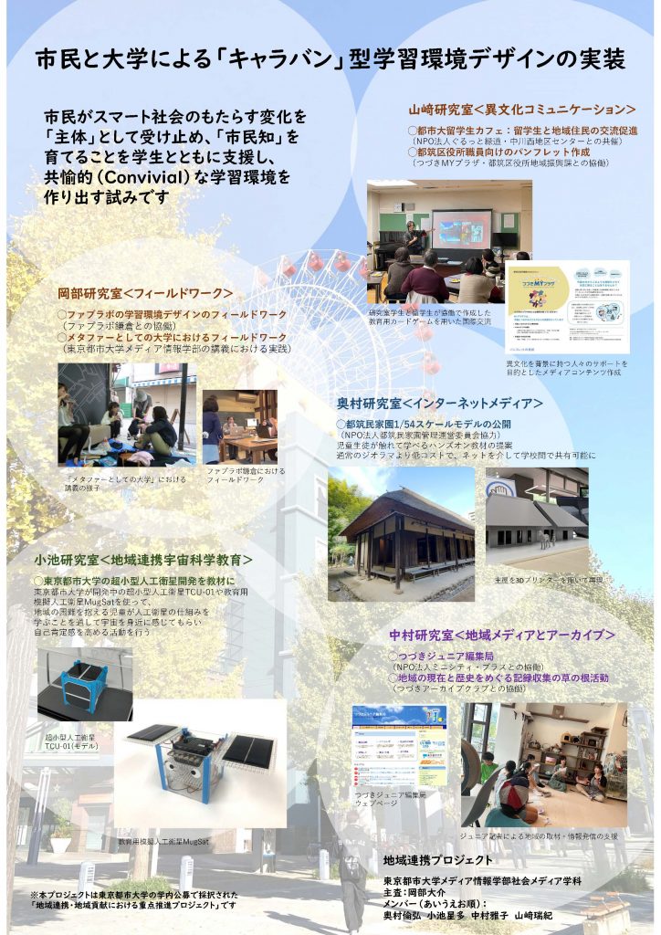 2025年10月3日~5日の期間、都筑区総合庁舎 区民ホールにて、メディア情報学部社会メディア学科の教員らが取り組む地域連携・地域貢献における重点推進プロジェクト「市民と大学による『キャラバン』型学習環境デザインの実装」の成果展示を行います。本プロジェクトでは、市民がスマート社会のもたらす変化を「主体」として受け止め、「市民知」を育てることを学生とともに支援し、共愉的(Convivial)な学習環境を作り出す試みを3年間に亘り行っています。